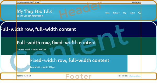 Row and content width in the content area of the page is set in the Beaver Builder editor, either in Global Settings or in individual rows. The screenshots in the previous sections show a content area with various row and content widths so you can see how they compare to the Customizer layout settings in the header and footer areas.