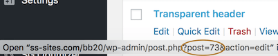 To make the transparent header apply to a page other than the home page, find the ID of the page by mousing over the page in the admin panel and viewing the ID number in the browser status bar, as shown in the following screenshot.