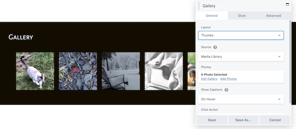 The Gallery module is used to display a gallery of images from either the WordPress Media Library or a SmugMug gallery that you specify.