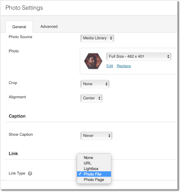• You can select the photo from your Media Library or use a URL. If the file is from the Media Library, you can select the size of the photo to display.