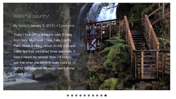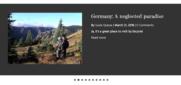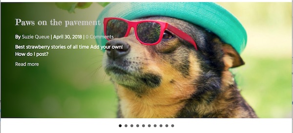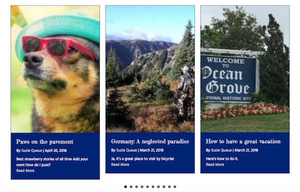 In a carousel, a few items are presented in a horizontal row, with animation or the manual ability to progress through a larger set. In the Posts Carousel module, the post or page title and other information are overlaid on the featured image. The following screenshot shows one of the variations of the Posts Carousel module, with the navigation shown as dots below the posts. See more examples later in this article.