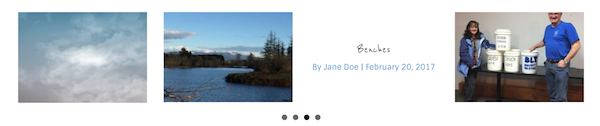 The Gallery layout of the Posts Carousel module displays the featured image in a single row of blocks of uniform height and width, and when you mouse over the image the title and post info are displayed with a color background, as shown in the screenshot below. You can't display post content with the Gallery layout.