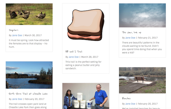 Posts or pages are displayed in top-aligned column groups. In this example, the columns are not set to equal height, so each group is top- aligned, but the bottom borders are adjusted to fit the posts.