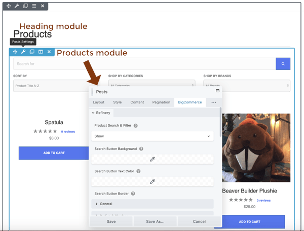 The Products module is actually a Posts module with some presets for BigCommerce product displays. It also has a BigCommerce tab, which lets you add fields to search and filter the products. - A Separator module to provide more visual separation between the heading and the display of products.
