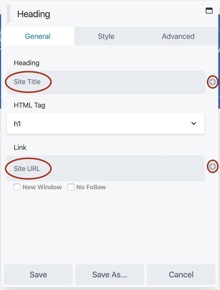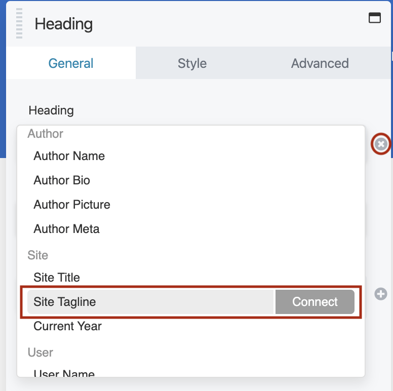 How does the Heading module display the name of the company? If you open the Heading module, as you can see in the screenshot below, there's a field connection to the Site Title, which means the information is being pulled from Settings > General > Site title, accessed from the WordPress admin panel. The plus sign to the right of the field indicates that it's possible to set a field connection for this field.